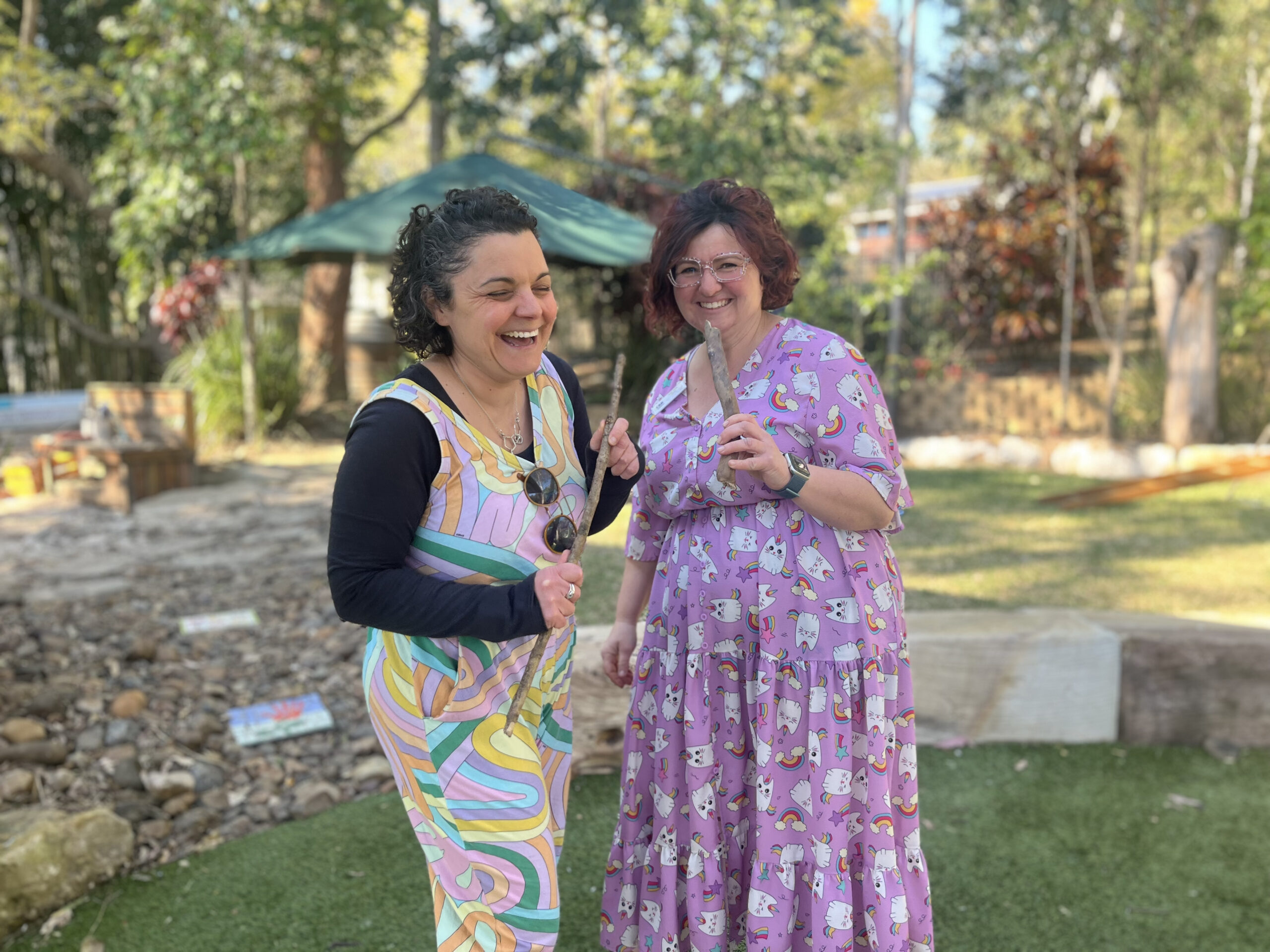 Parent, Delphie (left) and Wattle teacher, Sarah (right) have a chat (yes, the sticks are microphones today!) about Kenmore West,